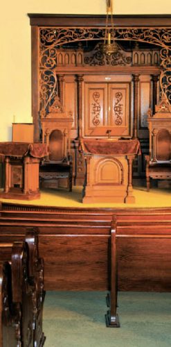 Christopher Madkour of the Huntsville Museum of Art described the Heritage Center as an “exquisite jewel box.” The original mantel, stained glass windows and rich wood floors and moldings impart great warmth to the room. The roll top desk is part of the Temple’s furniture collection and has been used by rabbis since the synagogue’s construction. The space has an air of quiet restfulness, as one feels the pres-ence of the scholars who studied, contemplated and wrote here in past years.