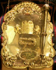 The Heritage Center is located in the original rabbi’s study, which is on the northeast corner of the sanctuary building. Marking the entrance to the Center is a collection of beautifully framed Torah covers. The Torah, which is handwritten in Hebrew, is Judaism’s central text. It conveys the foundational stories and laws of the Jewish people, including the Five Books of Moses, Genesis through Deuteronomy. The Torah is handwritten in Hebrew and rolled around two ornate wooden shafts, attached to either end of a scroll. As a sign of reverence, the Torah is covered with a cloak, or cover. The Torah covers displayed at the entrance of the Heritage Center are highly decorative, with gold embroidery and beading.